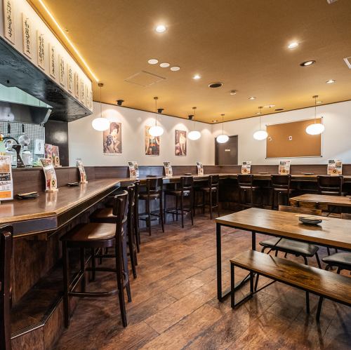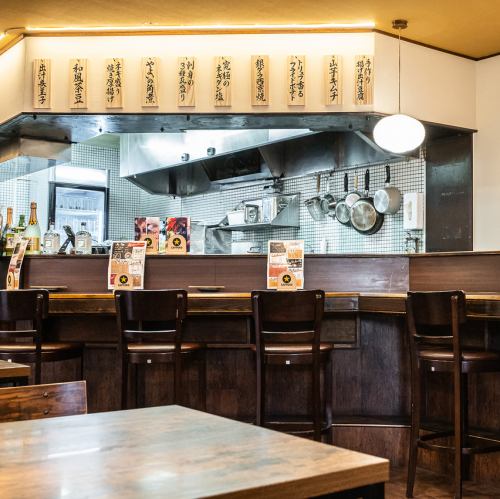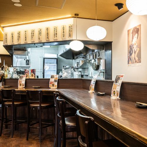 温かみのある木の質感が心地よいカウンター席では、目の前に並ぶ木札が昔ながらの趣を演出しています。調理の音や活気を間近に感じながら、お一人様でも気兼ねなく過ごせるのが魅力です。30代の働く世代が仕事帰りにふらっと立ち寄り、自分だけの時間をゆったりと満喫できる落ち着いた空間をご用意しています。